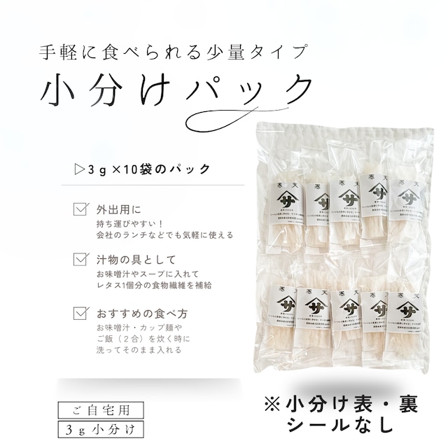 【ご自宅用】小分けデザインシールなし 使いやすい小袋パックで、いつでも手軽に使える細寒天が登場しました。1袋あたり3gの使いきりサイズで、毎日のお料理に便利です。スープ・サラダ・和え物や酢の物に最適です。 小分けなので、一品料理、おつまみ、外出先でも使い易いです。また、プチギフト、贈答用、お土産としてもご活用頂けます。 細寒天は、いつものお料理に加えるだけで「もはやサラダ」な食物繊維を摂取できます(本品は2.2g含有) 1袋3gでレタス1玉分の食物繊維※を摂取できます。 便秘改善や腸活などの効果が期待できます。 ※レタス1玉を200gとして、食品標準成分表八訂より算出 この細寒天は、天草のみを原料に作っております。安心してお召し上がりください。 天草には国産と輸入品をブレンドしております。 ※直射日光を避け、湿気の少ない涼しい場所に保管してください。 ※使用前にさっと水でもどし、洗い流してからご使用下さい。 ※食べ過ぎると便が硬くなったり、ゆるくなる可能性があります。
