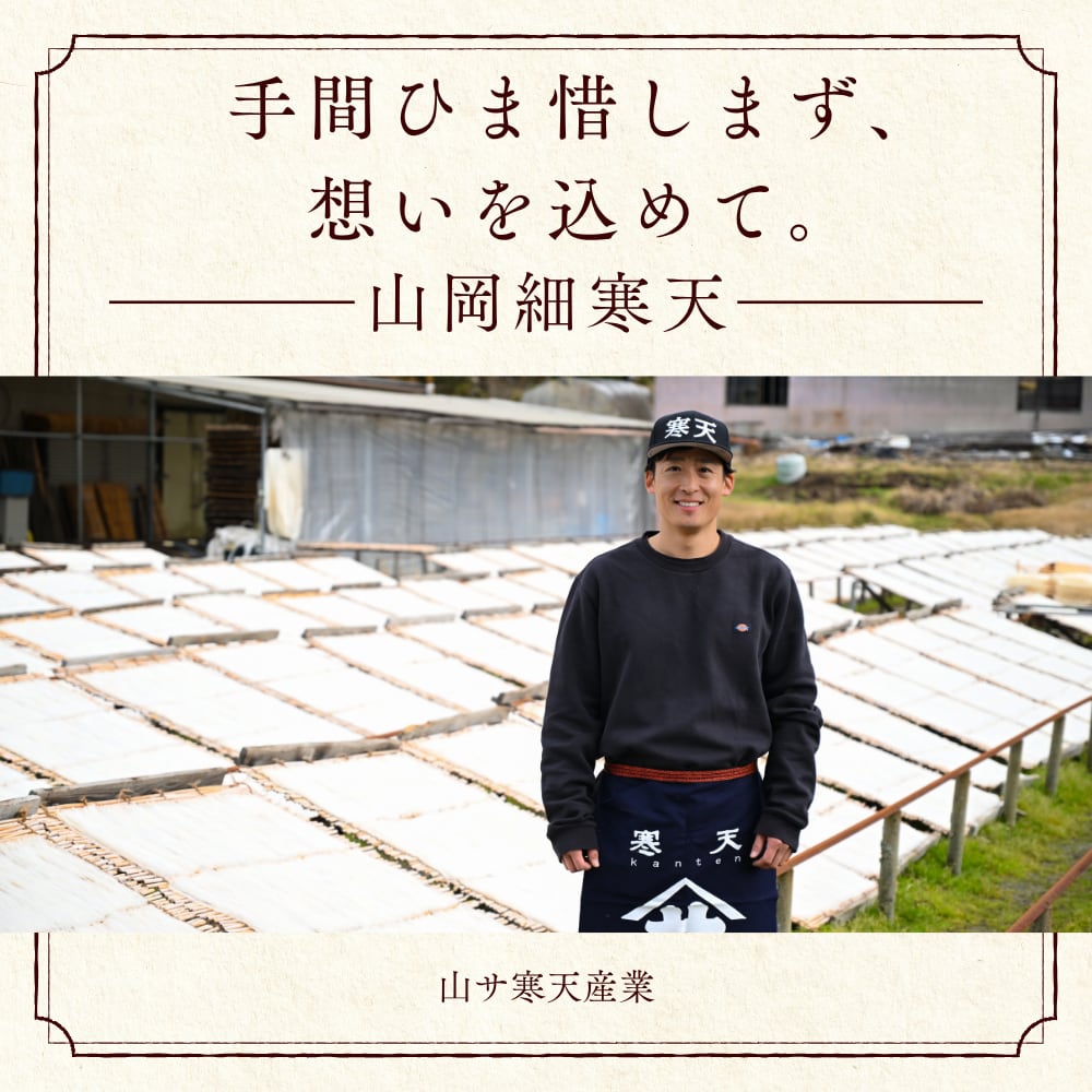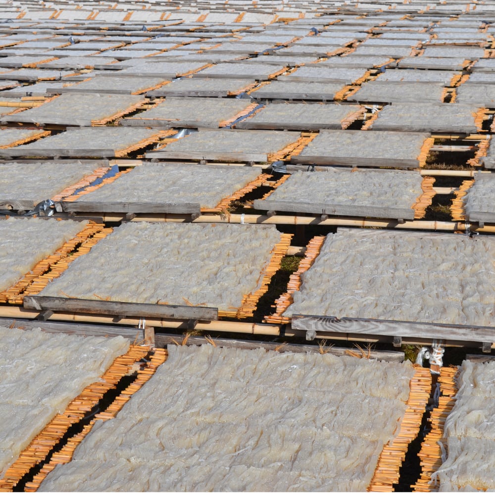 天然細寒天のシェア80%を占める、岐阜県恵那市山岡町にて、天日干しを繰り返し丹精込めて作り上げた細寒天です。